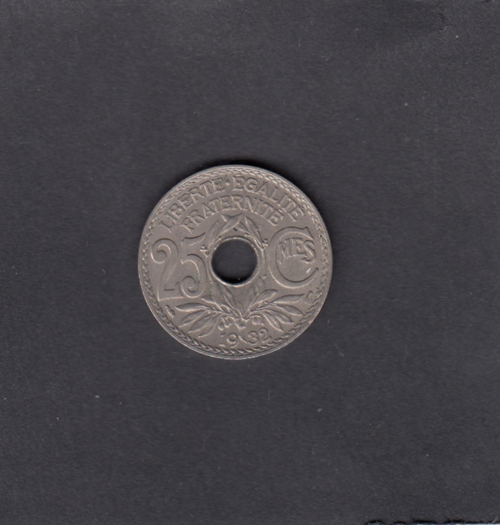 - XF, , 1932 25 Centimes HOLE - 25 Centimes HOLE, EUR