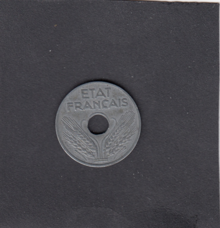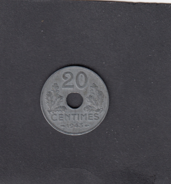 - XF, , 1943 20 Centimes HOLE - 20 Centimes HOLE , EUR